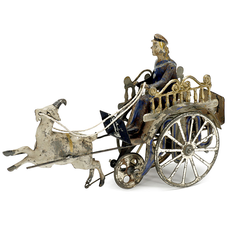 Unmarked, hand-colored tin, clockwork for the drive and the movement of the goat, length: 10 5/8 in., working.