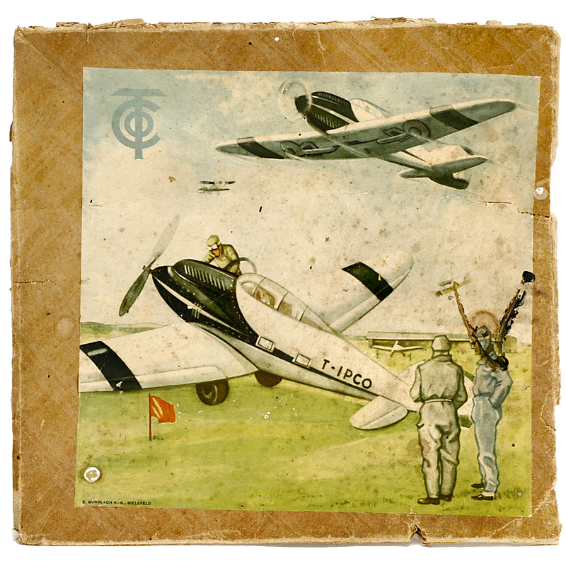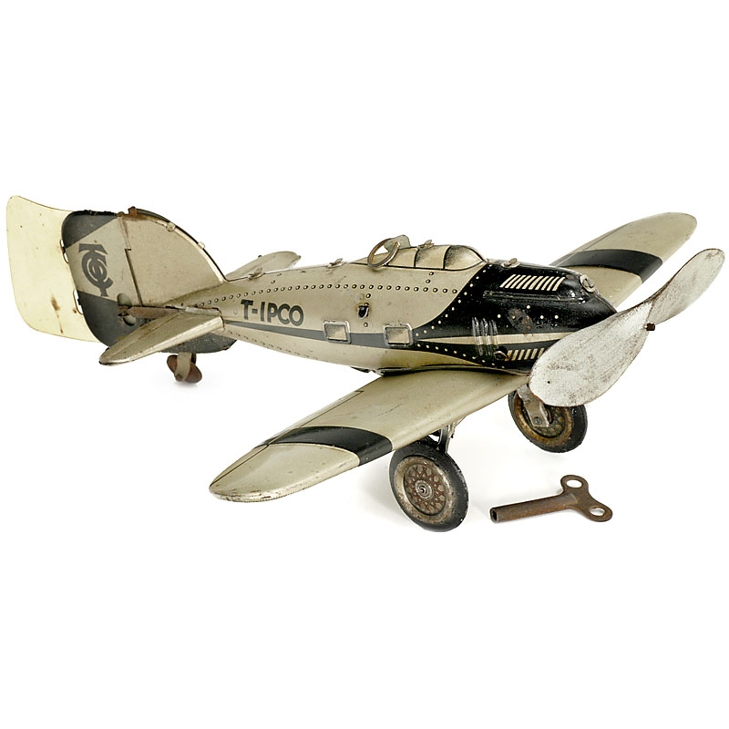Lithographed tin, clockwork (working), wooden propeller, semiautomatic recoverable undercarriage, length 10 5/8 in., with lid of the sales box. One wheel suspension restored.