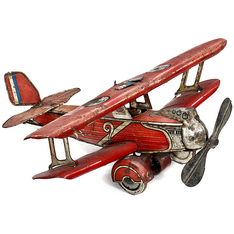 Manufactured by: "Siegfried Günthermann, Nuremberg", lithographed tin, clockwork drive on wheels and propeller (working), length: 13 in. In this Breguet type plane, Coste and Bellonte made the 1st nonstop flight from Paris to New York.