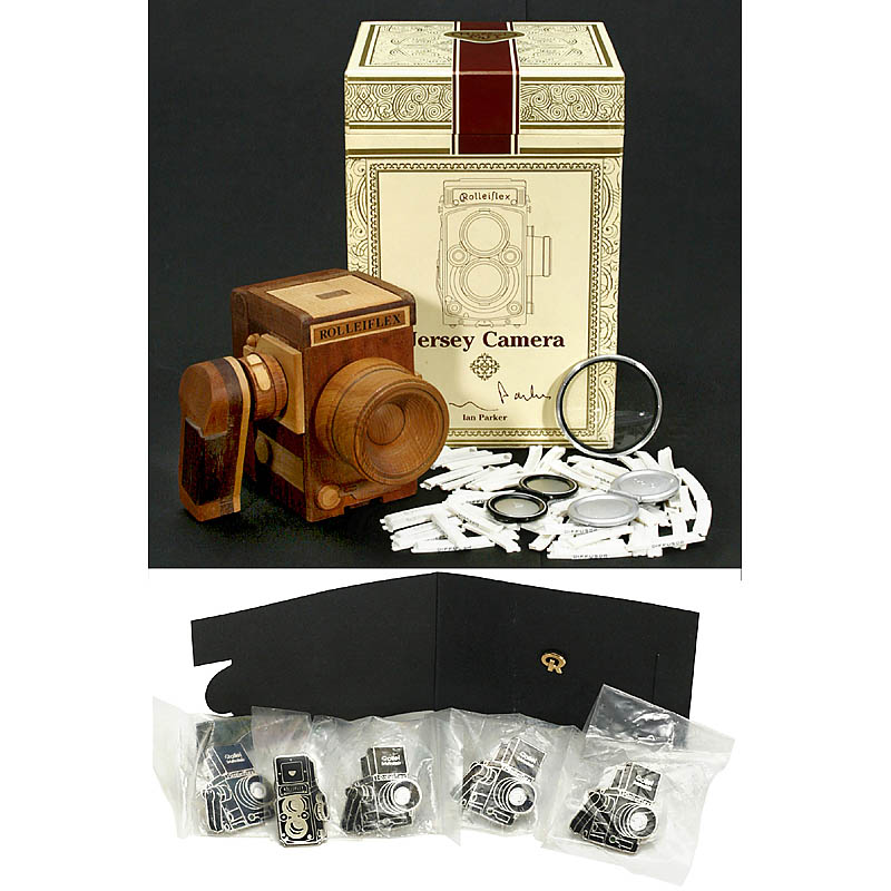 Rolleiflex 6003 SRC 1000 原尺寸木制模型。此外还有TLR Rollei Bajonettgröße II 和III 的2个镜头盖,64个TLR-Rollei 的"Diffusor",6个禄莱贴纸,Rollei Softar VI 和"Jersey Camera" 的纸盒包装。