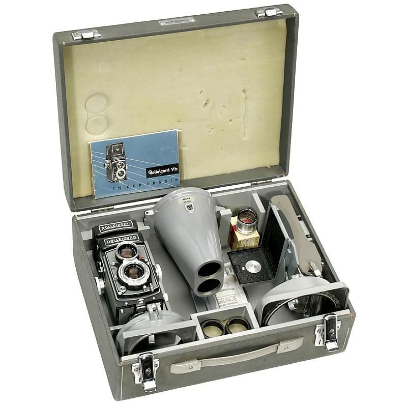 完整!Franke & Heidecke, Braunschweig. 设备装置:Rolleicord Vb, Nr. 2610809, 带Rolleicopi(状态完好如新!),相机和Philips PM9300 的箱子,偏框,2个接板,Polaroid 宝丽来后背,2个密封条,2个Rolleinare 4,16和24计数器,2个罩,镜头盖,说明书。非常罕见的完整设备!相关文学作品:Claus Prochnow, "Rollei Report 2",447,480,481页。