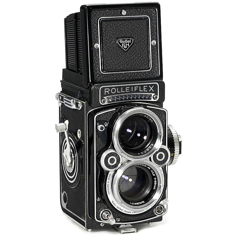 Franke & Heidecke, Braunschweig. No. 2476617, export camera for East Europe with "Opton PL 2,8/80 mm Oberkochen", no. 5389171. Synchro-Compur, coupled light meter. – Rare export camera in excellent condition! With lens cap and Benser case.