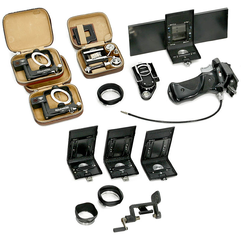 Franke & Heidecke, Braunschweig. 1)手枪握把式快门线 2) Rolleimeter 2,8, 1956年,带盒子已经说明书原件 3)Rolleifix 带全景云台 4)Rolleimeter 3,5 带盒子 5)2个RIII折叠罩 6)Rolleikin 2 ,带计数器按钮,盒子 7)Triplex 适配器,Nass出品,汉诺威 8)3个禄莱相机后盖和更多配件。 Franke & Heidecke, Braunschweig. 1) Pistol grip with cable release. – 2) Rolleimeter 2,8, 1956, with case and original instruction manual. – 3) Rolleifix with panoramic head. – 4) Rolleimeter 3,5, with case. – 5) 2 x collapsible sun shade III. – 6) Rolleikin 2 with counter knob, case. – 7) Triplex adapter by Nass, Hannover. – And: 8) 3 Rollei camera backs and more accessories.