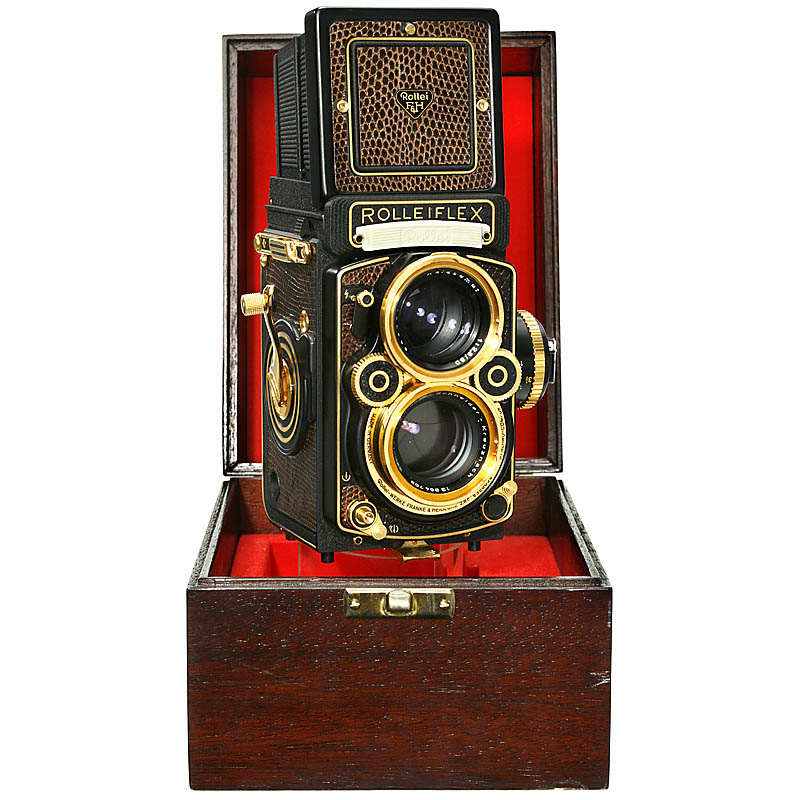 Rollei-Werke Franke & Heidecke, Braunschweig. Goldplated commemorative model with brown alligator leather covering. No. 8300656. Xenotar 2,8/80 mm in Synchro-Compur. With original teak box, lens cap and instruction manual. – Gorgeous exhibition item.