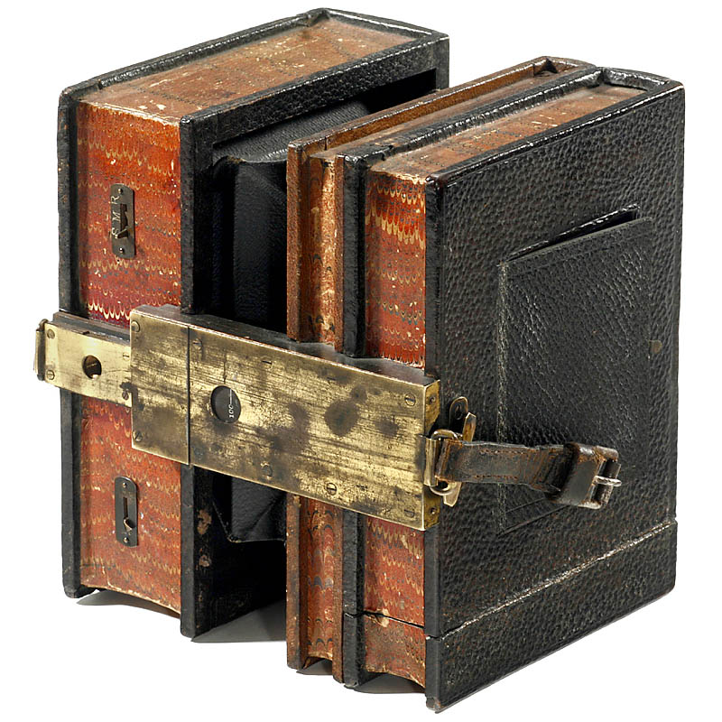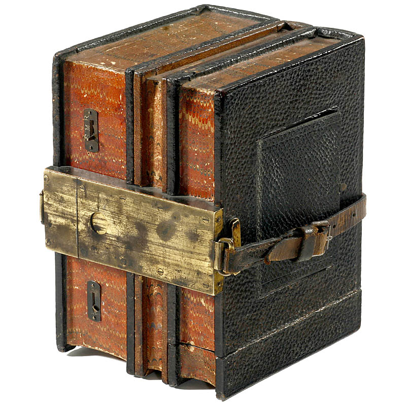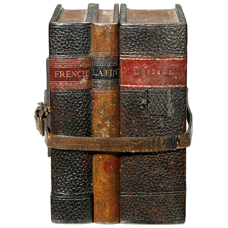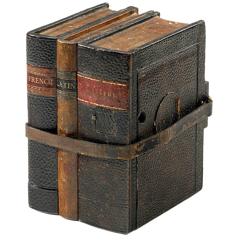 Scovill & Adams Book Camera, 1892 Scovill & Adams, USA. One of the rarest of all the detective cameras! Disguised as a stack of 3 books, titled: French, Latin, Shadows. With original leather carrying strap. Wide-angle lens with variable stop, guillotine shutter (working), ground glass finder, photograph format 4 x 5 in. (1 cassette inside), stamped "2" inside. Camera in original unrestored working condition. – Very attractive exhibition piece and desirable collectors item! Museum piece! Only 6 examples known worldwide! – Literature: Michel Auer, "150 ans d'appareils photographiques", no. 91. – Michel Auer, "Kameras gestern und heute", p. 92. – And: Todd Gustavson, "A History of Photography from Daguerreotype to Digital", George Eastman House, p. 103.