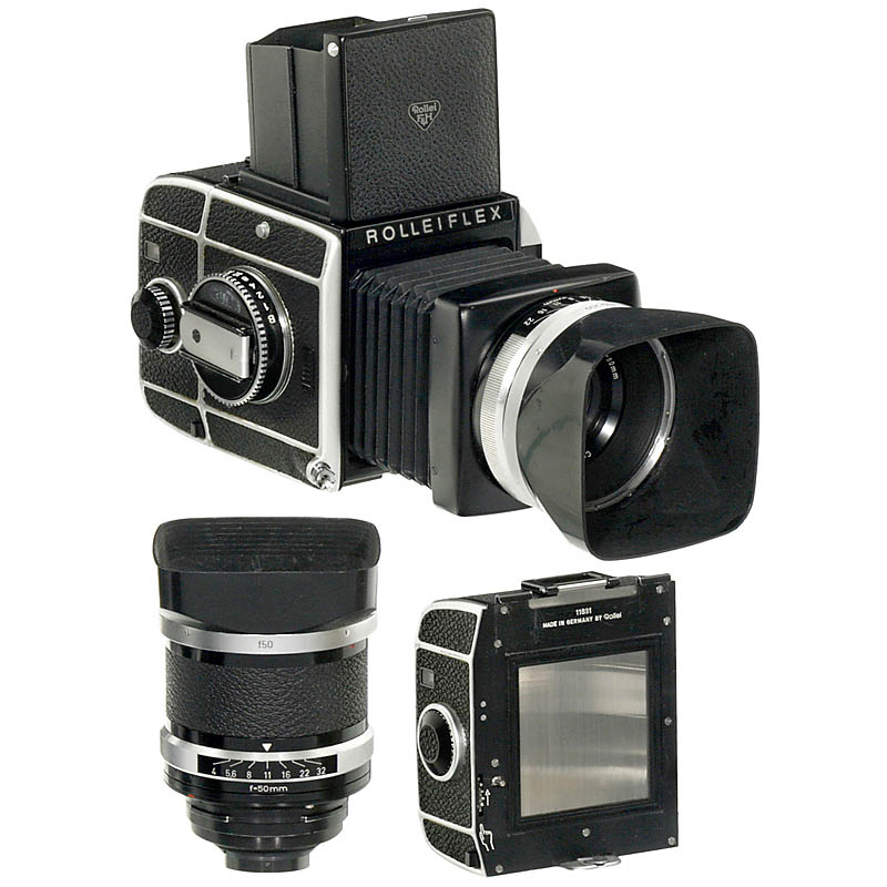 Franke & Heidecke, Braunschweig. 1) Rolleiflex SL66, no. 2904668, 1966 with Planar 2,8/80 mm, waist-level viewfinder, lens hood, grip and instruction manual. 2) Distagon 4/50 mmm, lens hood. 3) Prism finder, with case. 4) Rollei rigid waistlevel
