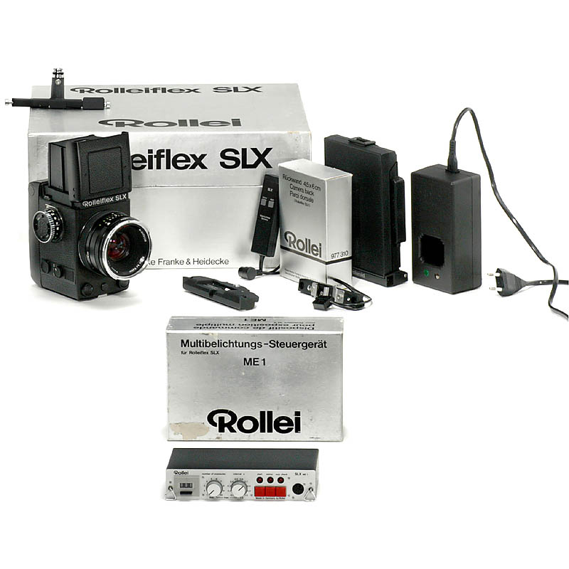 Rollei, Braunschweig. 配件有:Rolleiflex- SLX 带Planar 2,8/80 mm HFT 镜头,充电器和电池,遥控器和说明书。相机正常工作。配件:多重曝光控制装置ME1(完整带连接线和说明书),宝丽来后背,4,5 x 6 cm 后盖和其他更多配件(未测试)。