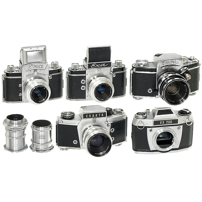Ihagee, Dresden. 1) Varex IIa, version 1, 1956, no. VX IIa 825316, Ennalythh 1,9/50 mm, prism finder. 2) Exakta VX 1000, version 1, 1967, no. 1155194, Biotar 2/58 mm T, Nr. 3949116, prism finder. 3) Exa, version 1.5, 1951, no. 227811, Meritar 2,9/50 mm, waist-level finder. 4) Exa, version 6, 1961, no. 613545, Meritar 2,9/50 mm, waist-level finder. 5) VX 200, 1969, no. 362493, without lens, with 2 extension tubes.
