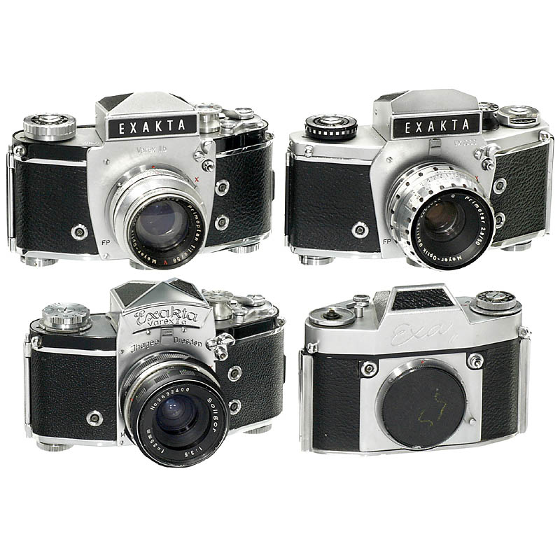 Ihagee, Dresden. 1) Varex IIa, c. 1956, Nr. 830104, version 1, with Soligor 3,5/35 mm, pentaprism finder. 2) Varex IIb, c. 1963, no. 1112866, Primoplan 1,9/58 mm, pentaprism finder. 3) VX 1000, c. 1967, no. 1134557, version 1, Primotar 2,8/50 mm, pentaprism finder. – Add-on: Exa II body (not working).