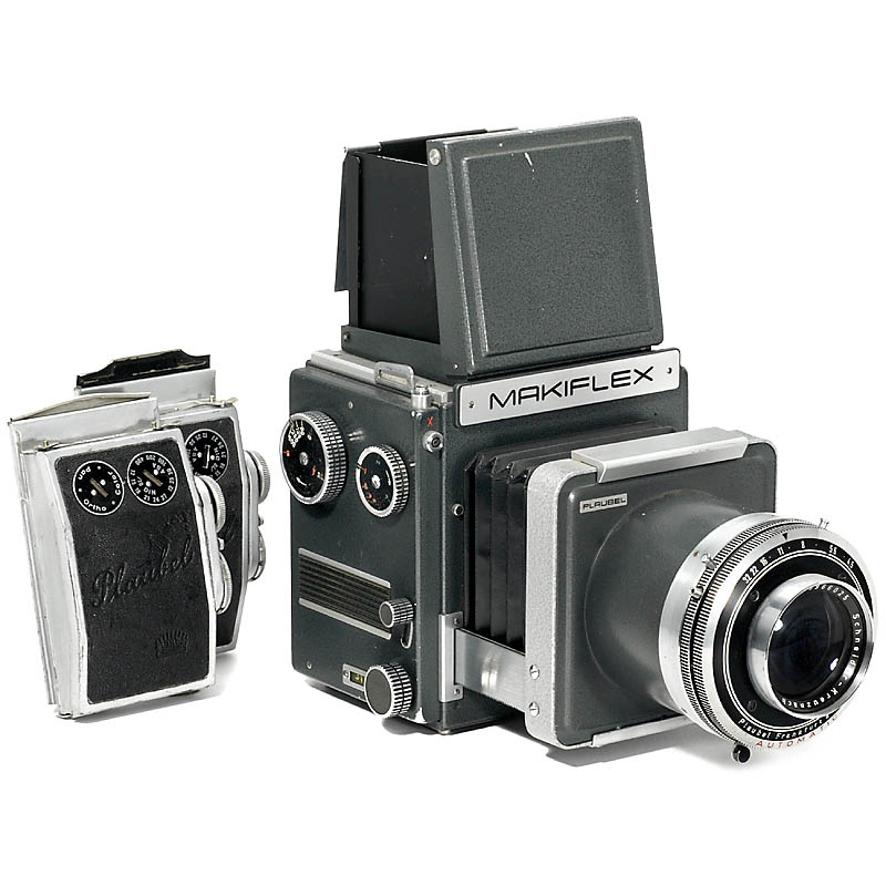 Makiflex, 1961, Plaubel 产, SLR 9x9cm, 卷帘式快门 1-1/500 sec., 速度不准, 俯视取景, Xenon 4.5/210mm Automatic, 2 个自动计数后背6x9cm 和 6x6cm