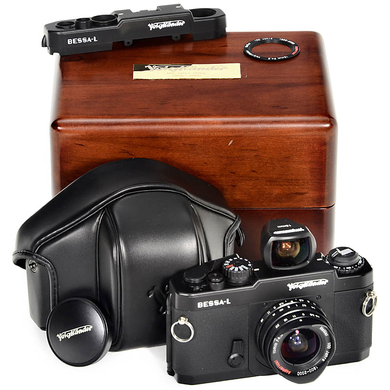 Voigtländer, Braunschweig. No. 116/500. With Heliar 4,5/15 mm Aspherical "100 Jahre 1900–2000", viewfinder. Complete with papers, wooden case and box. – Special bonus: Original cover plate for Bessa-L with special no. 1/500! With maker's case.