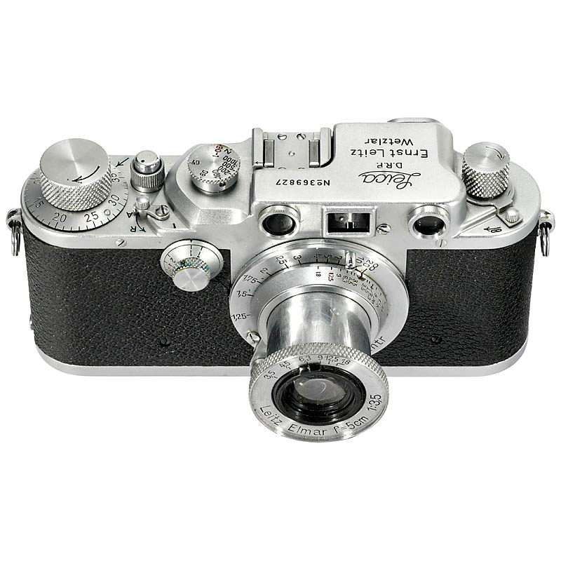 Leitz, Wetzlar. No. 369827, red curtain, shutter working excellently, with Elmar 3,5/5 cm, no. 546509, cap and case.