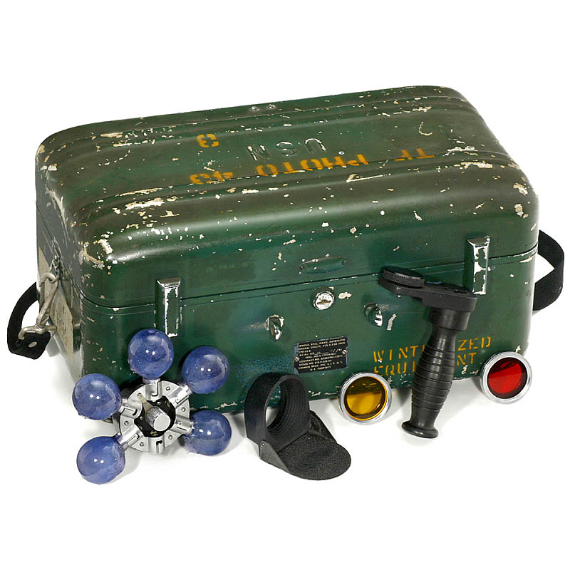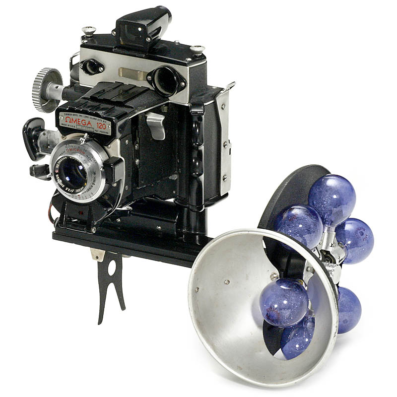 Simmon Bros., New York. No. 81382, for 6 x 7 cm on rollfilm 120, Omicron 3,5/90 mm, Omicron shutter 1– 1/400 sec., coupled rangefinder, shutter and rangefinder working excellently. With original "USN" case, lens hood, yellow and orange filter and very rare original automatic flash "Omega F-120 Multiflash with Capacitor", no. 84969, and second flash magazine, instruction manual in English (copy). – Very rare and attractive American reporter camera!