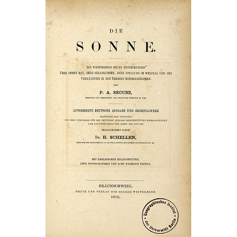 "Druck und Verlag von George Westermann, Braunschweig". Hardcover, 392 pages, with original photography of the sun by Lewis M Rutherford in New York, September 22, 1870.