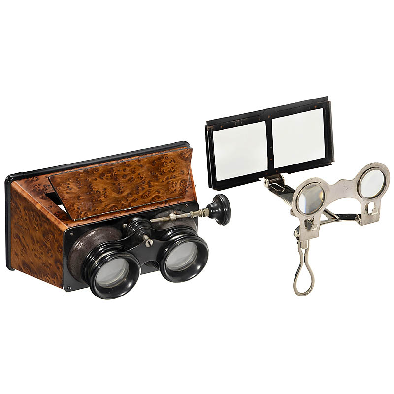 2) Folding stereo viewer, metal, for cards and slides with size 6 x 13 cm.