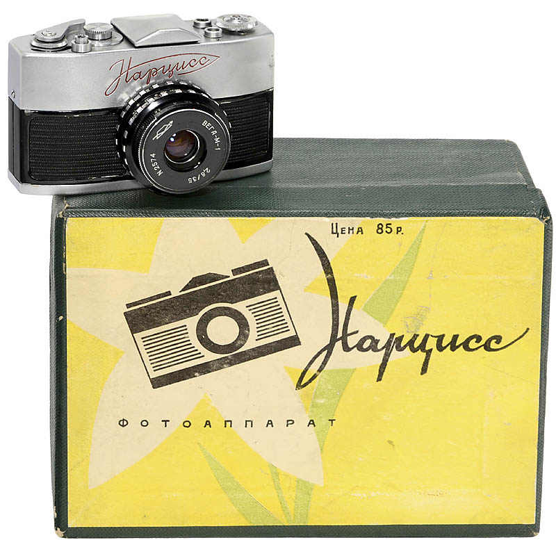 KMZ, USSR. SLR 14 x 21 mm, black leathered, red Cyrillic lettering, "Vega M-1 2,8/35", focal plane shutter, complete with box, instruction manual, case and lens cap.