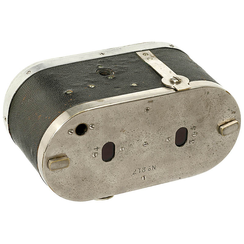 Devaux & Deloye, serial no. 217, size 6 x 13 cm on rollfilm type 120. Lenses: 2 Anastigmats à Prismes "Jonte" 1:8/54 mm, two 90° prisms reflect the image at right angles from the lenses onto the film, built by Devaux, designed by Deloye, guillotine shutter for five speeds. Very rare stereo camera, much rarer than the 45 x 107 model. – Literature: J. P. Francesch, "Les Appareils Photographiques Français", no. 1456. – M. Auer, "150 ans d'appareils photographiques", no. 253. – Sensationally rare!
