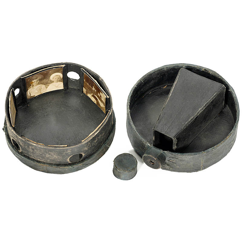 Offenstadt, France, 90mm meniscus lens, with original lens cap (= shutter), 5 original internal prints, the enclosed test photographs show that it was intended as more than a toy. – Literature: Michel Auer, "Kameras gestern und heute", p. 91.