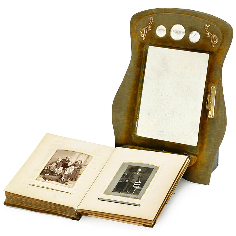 With 12 gilt-edge sides, for 46 Carte-de-Visite and cabinet prints (with 43 prints), lithographed cover, with cylinder movement (playing), 17 in. high. – A superb collector's item!