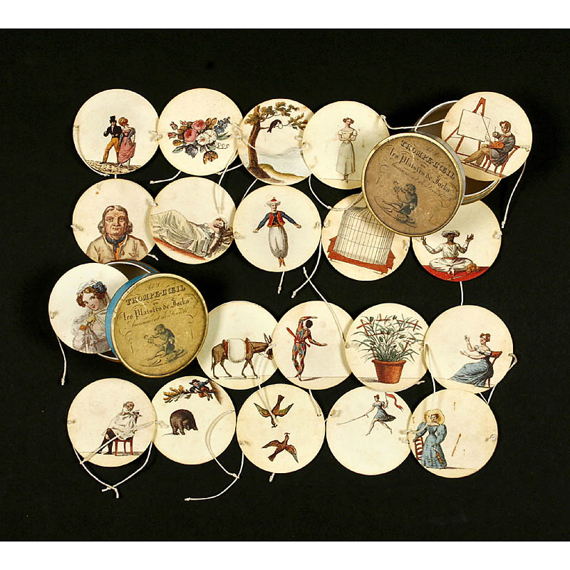 France, 2 cardboard boxes, each with 10 Thaumatrop discs, Ø 2,7 in. Replicas from old motifs. In best condition.