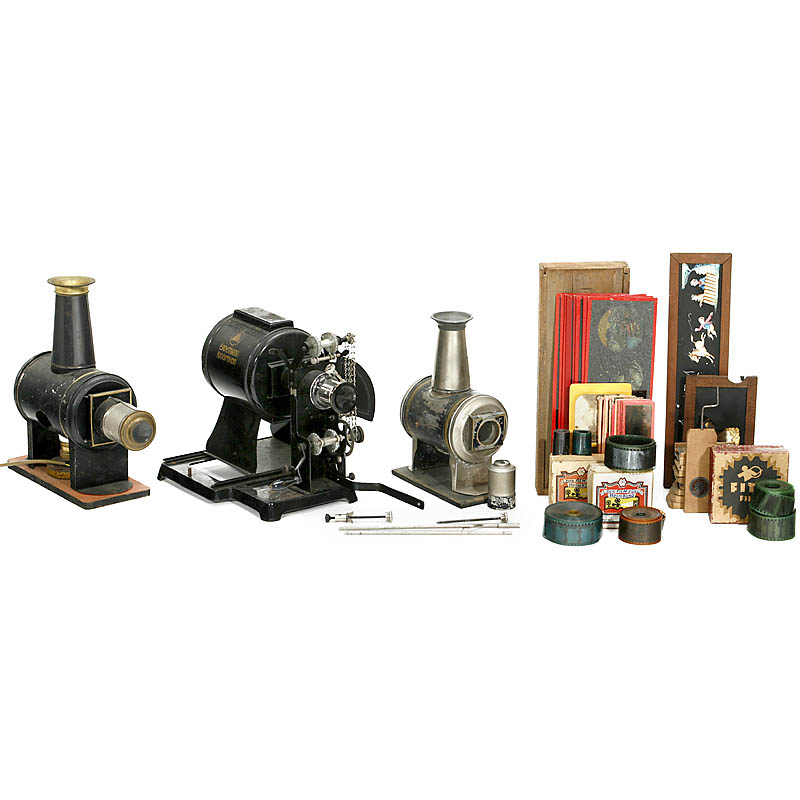 girl moves the eyes." – Ernemann Kinoptikon film projector, in original cardboard box. The projector is not complete but in good condition. – Most parts of this lot can be restored.