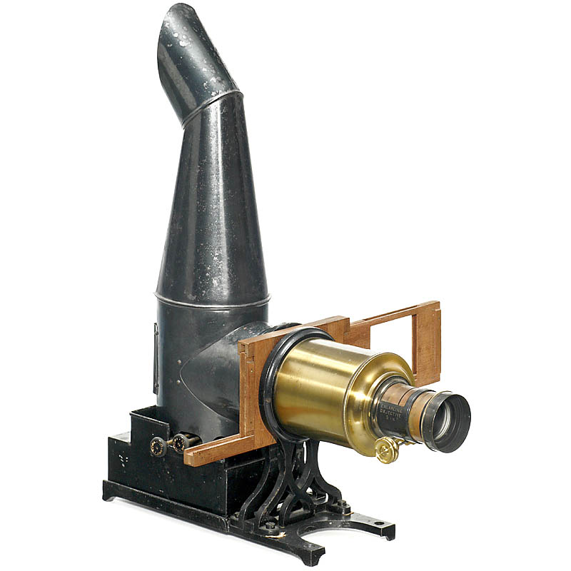 W. Hume, Edinburgh. Height 22 in., 18 in. long, brass lens, with rack-and-pinion focusing, for 3 1/6 in. slides, with chimney and original burner. Very nice original condition.