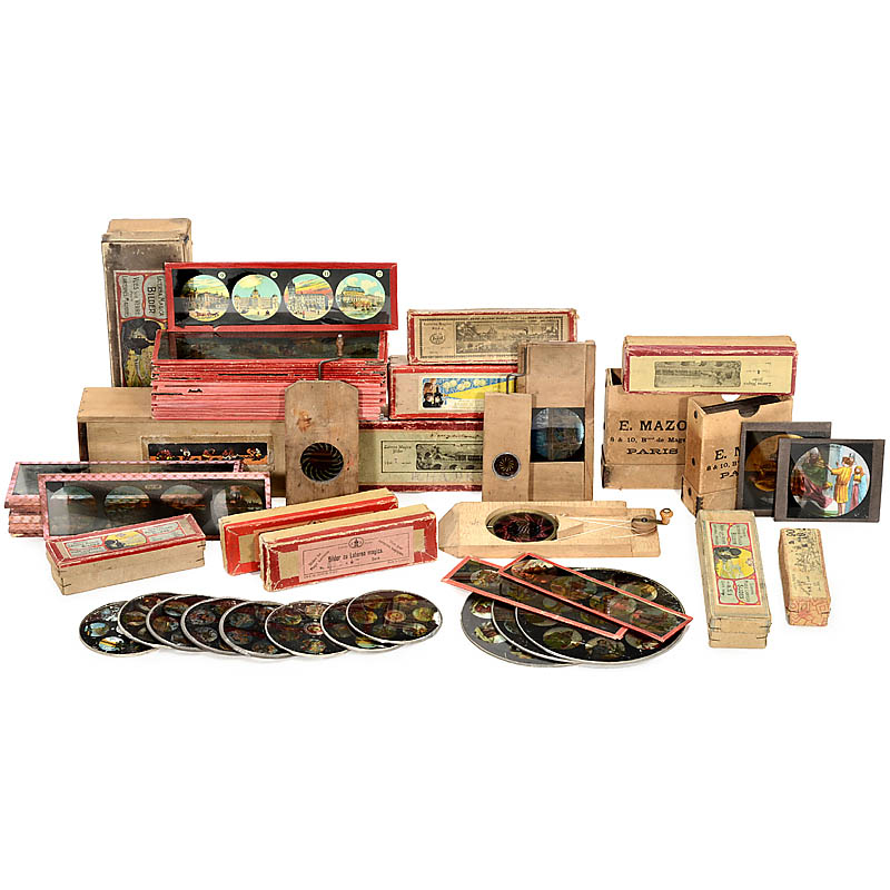 More than 100 different slides: circular slides, zoetropes and normal slides in different sizes.