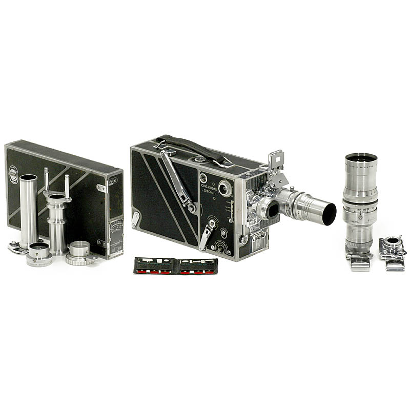 Eastman Kodak, Rochester, USA. 16mm movie camera for 30m daylight cassettes, handcrank drive, 8–64 p/s, rotating head for 2 lenses. 4 lenses: Kodak 1:2,7/15 mm, 1:1,9/25 mm, 1:2,7/102 mm and 1:4,5/115 mm. –Add-on: Accessories.