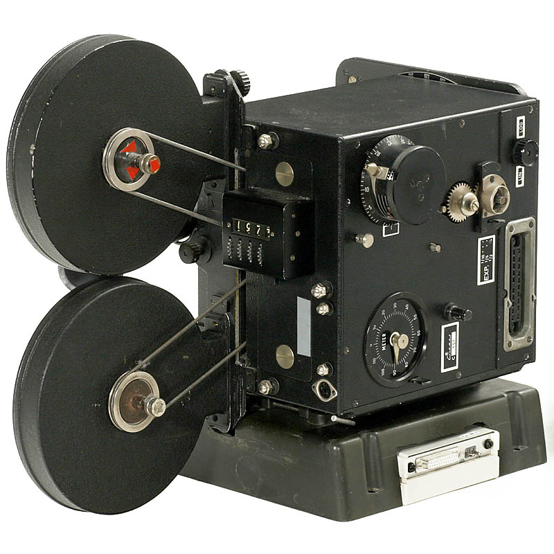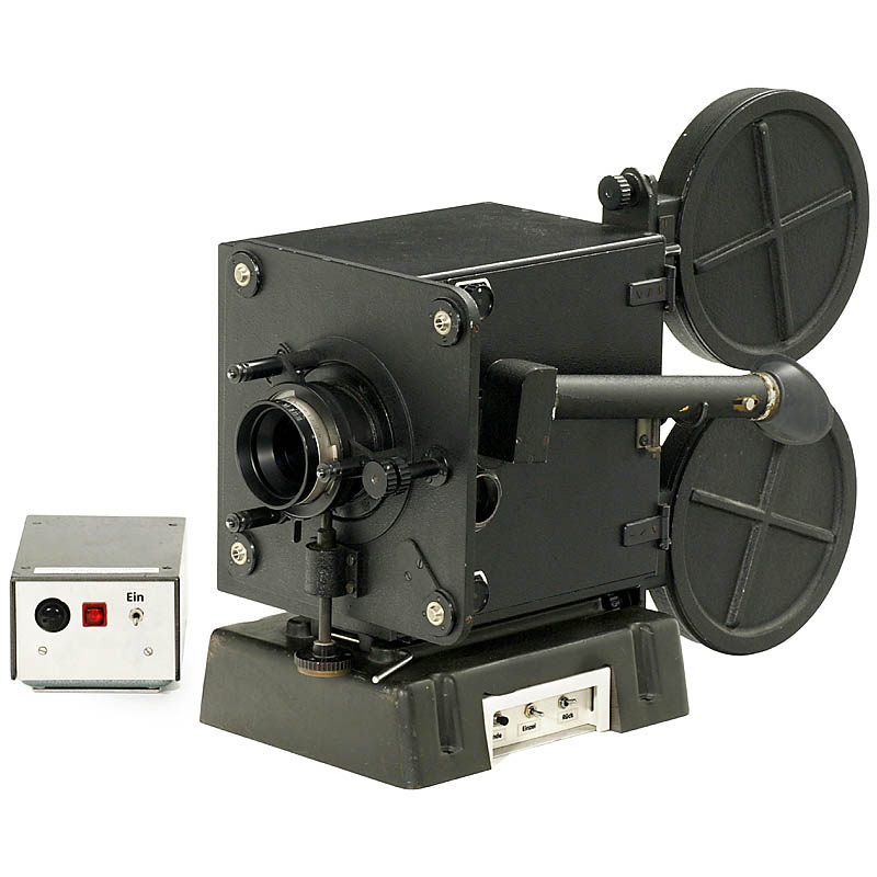 Professional movie camera for 16mm film, with 2 cassettes for 120 m film, lens: Schneider Xenon 2,3/50 mm, with new mains unit and new control unit for single frame or continuous operation.