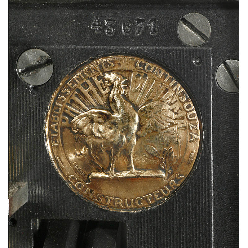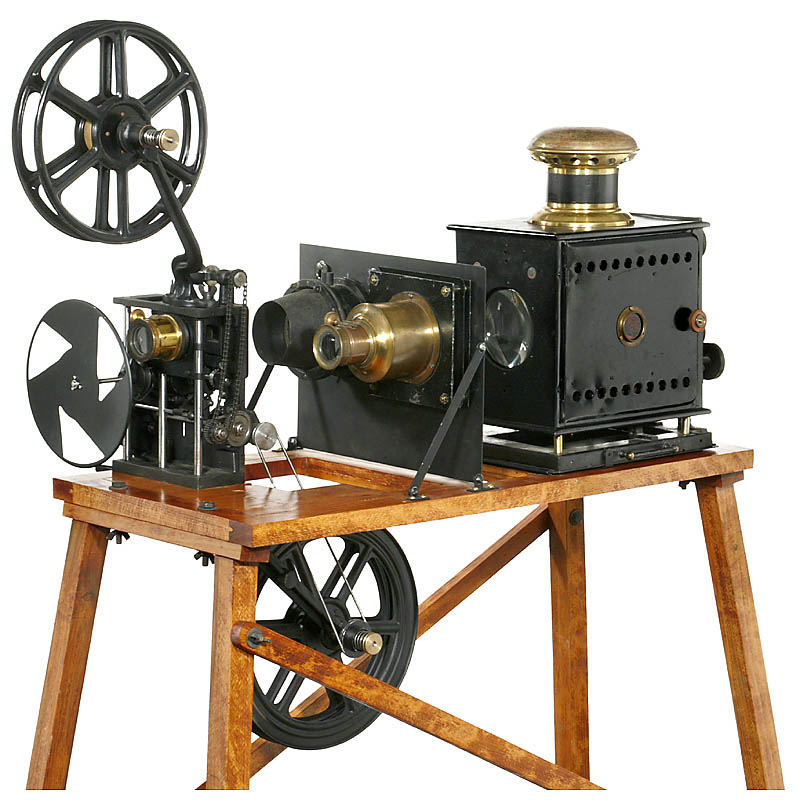 For 400m film spools, projection head with Maltese Cross; original Pathé lens, crank and lamp house; additional projection head for glass slides, sliding lamp house for both projection heads, on new wooden stand (made from period wood). Untested electrical functions. A rare example of early European cinema history!