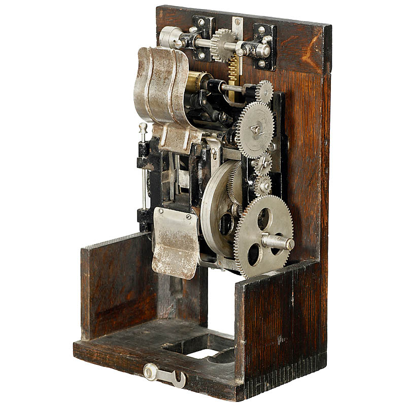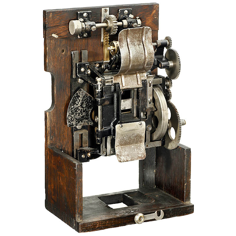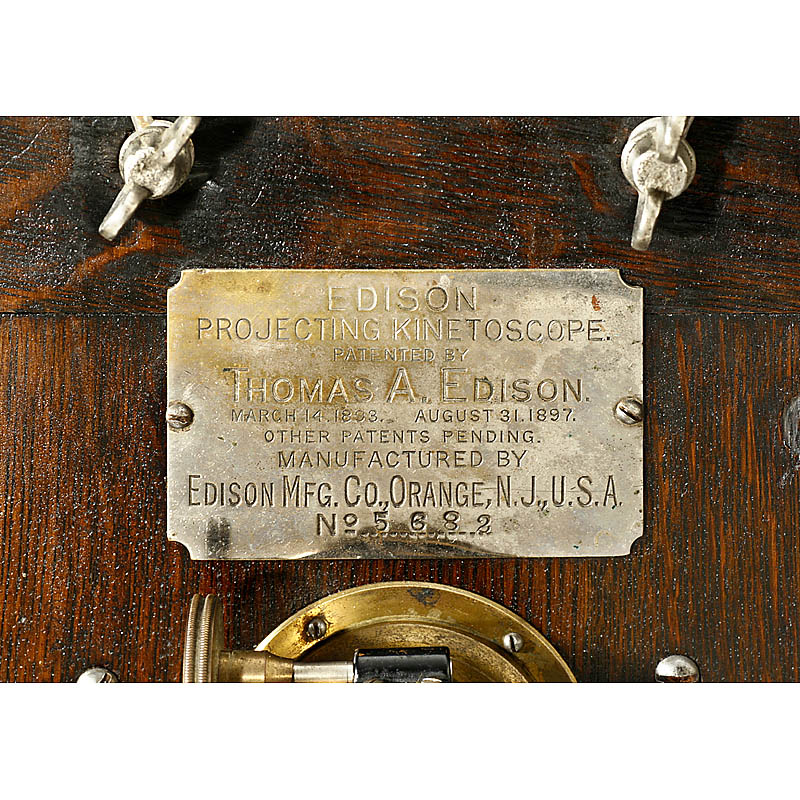 Edison Mfg Orange, USA. Early original Edison projector for 35mm format (introduced by Edison), original brass lens with rack-and-pinion focusing (18 in.), "Edison" and "Thomas A. Edison" label, no. 5682, without handcrank, with original wooden front cap. – A terrific