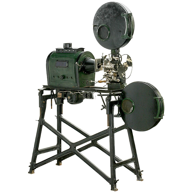 Manufactured by: "Moon, Birmingham". With Maltese Cross, fire protection drums for reels up to 900 m, nickel-plated gearwheels, handcrank or electric motor(added) drive, on cast-iron table. Unrestored untested condition.