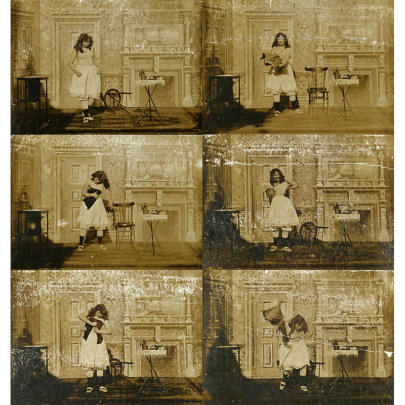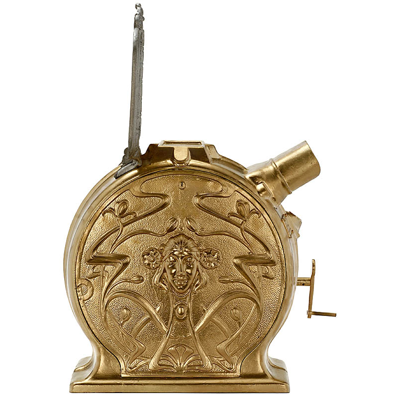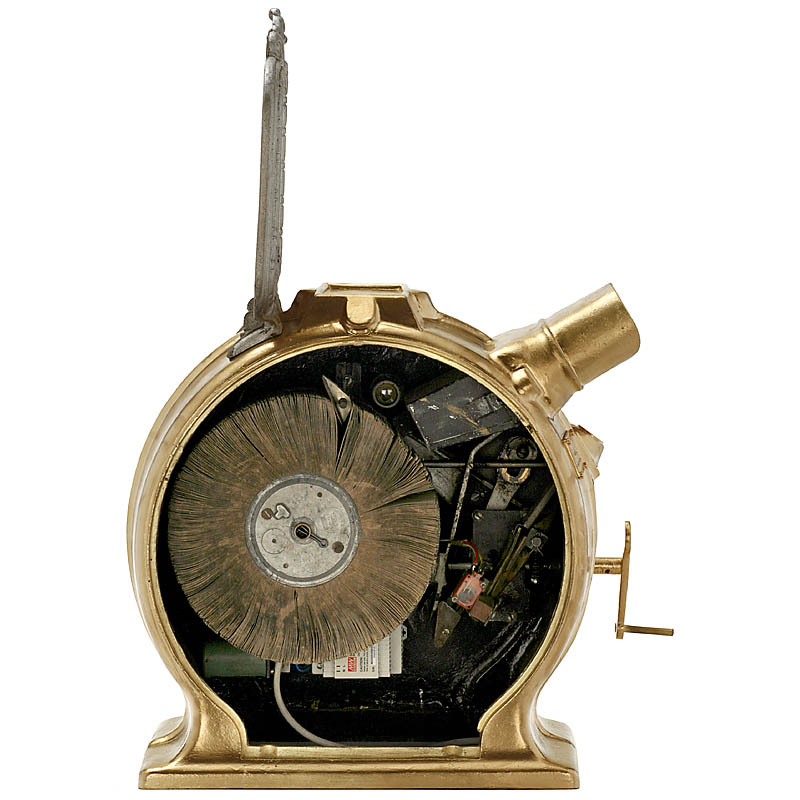 Exceptionally rare table model of early Berlin production,with wonderful decorative Art-Nouveau motif on both sides. Probably from the very first and only prototype series as nearly nowhere else known. With original Mutoscope reel "Anger as the Undersized Corset". Marquee sign probably later. – A fascinating rare collector's item and museum piece!