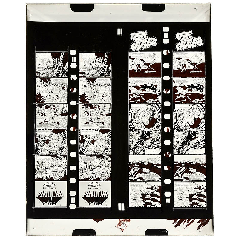 Designed by Joan Nieto, Spain. Title: Pinocho, 13 printing plates, size 24 x 30 cm (9 ½ x 11 ¾ in.), for 3D children’s movie projector, with example pattern on paper. – Very rare!
