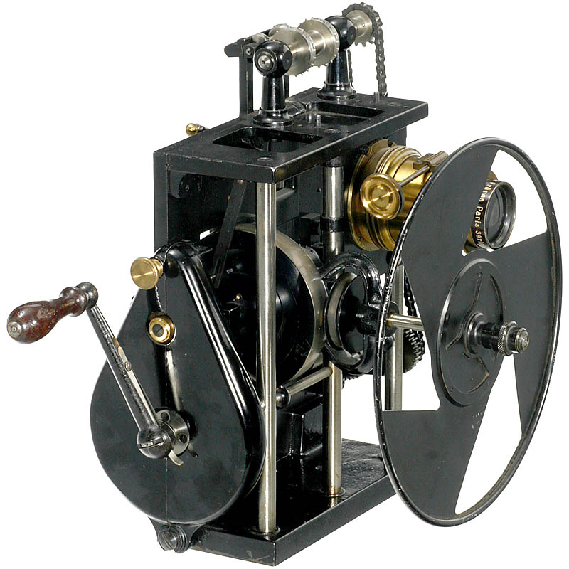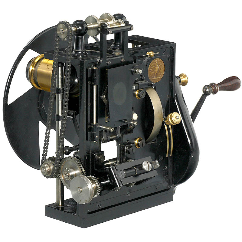 Manufactured by Pathé Frères, Paris, for 35mm film,crank-operated. At that time, the best movie projection head in Europe.