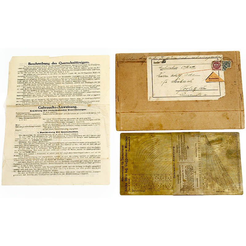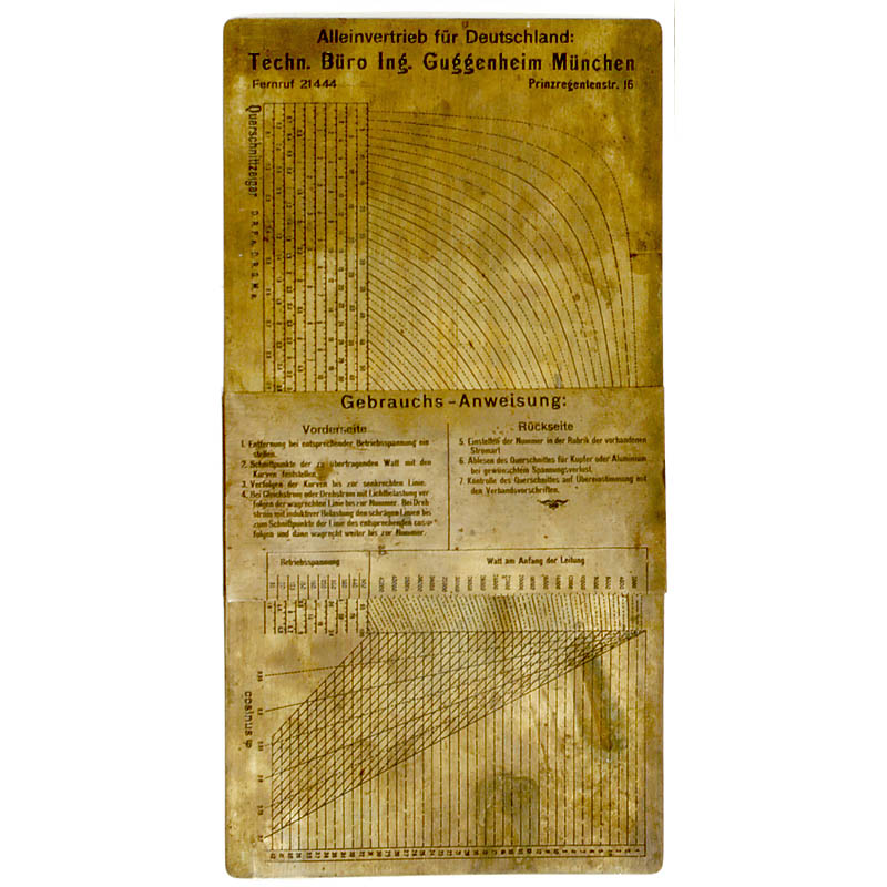 Distributed by "Techn. Büro Ing. Guggenheim", Munich,Germany, engraved brass, for the calculation of cable thickness, with instruction sheet and original shipping envelope, enormous former sales price: 5,496 RM. – Extremely rare!