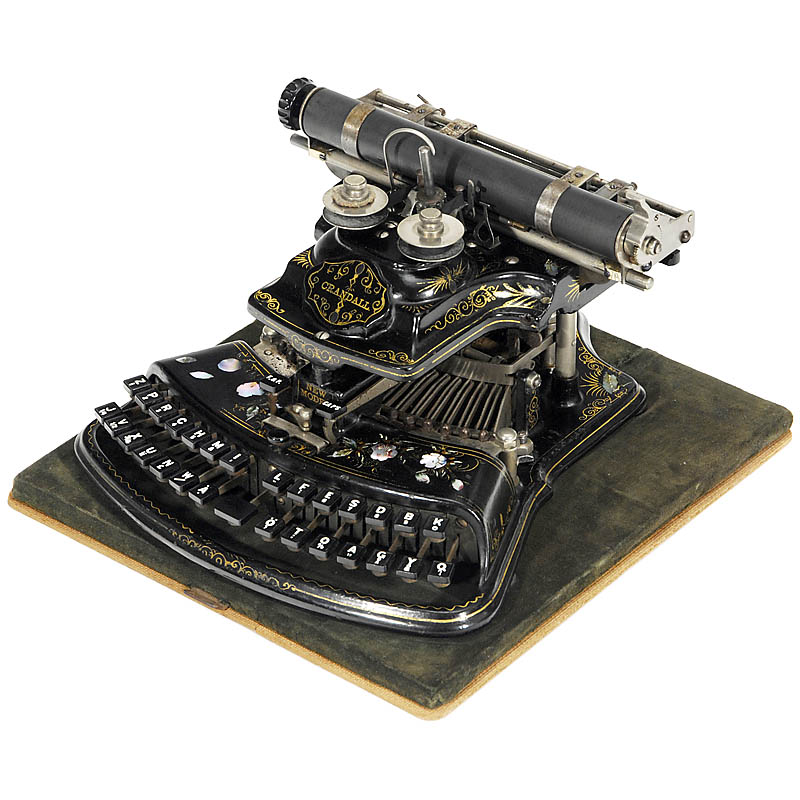 Excellent model of the popular American type sleeve machine by "The Crandall Type Writer Co., Groton, N.Y.". – Serial no. 17302. One of the most attractive typewriters ever with mother-of-pearl and gold decorations. With original case. – A superb pioneer and collector’s item and museum piece.