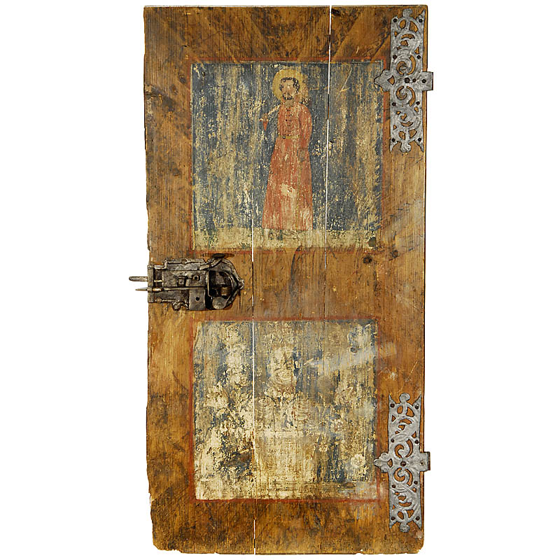 Hand-painted door pane ( 25 3/5 x 51 in.), with handwrought spring lock and 2 engraved door hinges.