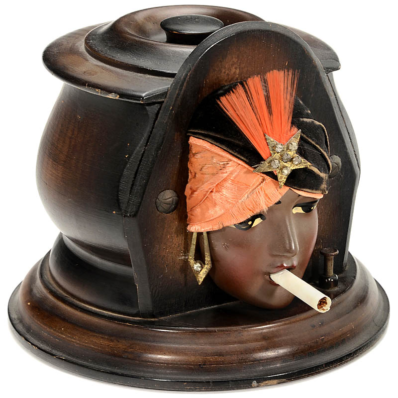 USA, manufactured by "Kindel & Graham, San Francisco", ceramic head with turban, wooden box. When pushing the button a cigarette comes out of his mouth.