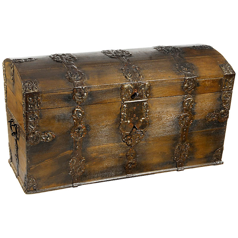 Solid oak, wooden dowels, hand wrought-iron fittings, with lock and key, size 51 x 25 x 28 ¾ in.
