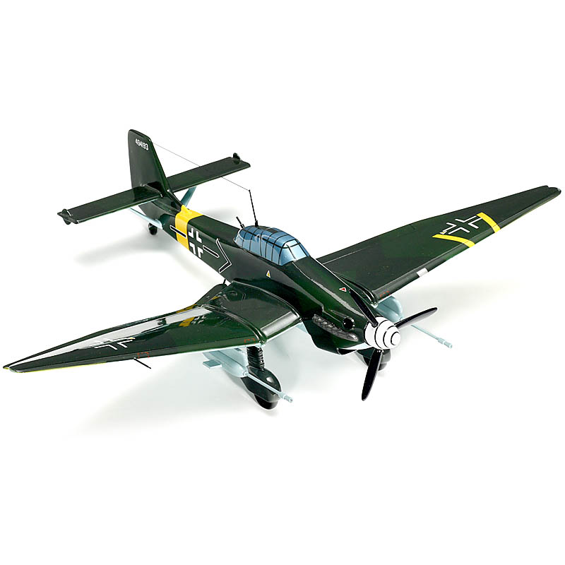 underwing mounted dummy 37 mm anti-tank cannons, the fin without complete Luftwaffe markings, but with Werk No. 494193, 19 in. (48 cm) wingspan. This is the model of one of the aircraft flown by Hptm. Hans-Ulrich Rudel, the only pilot of the "Luftwaffe" to be awarded the Knight's Cross with Golden Oakleaves.