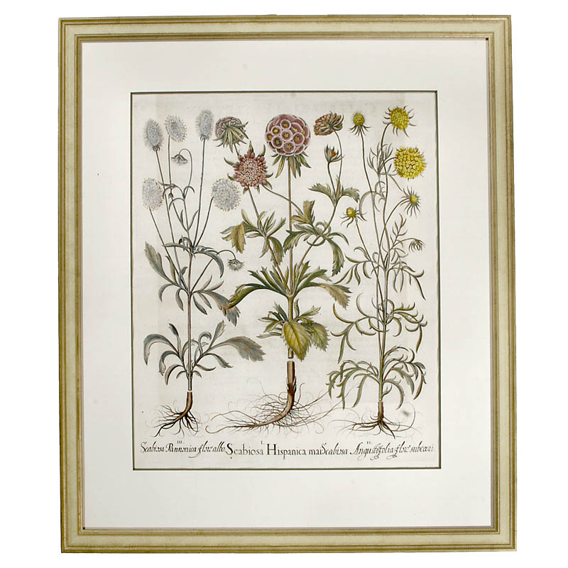 I. Scabiosa Hispanica mai. II. Scabiosa Angusti folia flore subcaeri. III. Scabiosa Pannonica flore albo. Hand-colored engraving from the earliest large botanical book "Hortus Eystettensis" (Garden of Eichstätt), published in 1613 in 1st edition by the botanist and horticulturalist Basilius Besler at Eichstätt near Nuremberg, on hand-made laid paper, backside with text, large size 18 ½ x 21 1/3 in., framed with glass and passe-partout (frame size 24 x 28 1/3 in.).