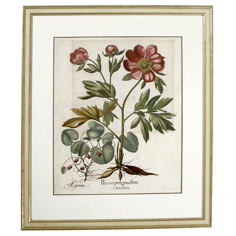 Pæonia peregrine flore coccineo (Wild scarlet peony). Hand-colored engraving from the earliest large botanical book "Hortus Eystettensis" (Garden of Eichstätt), published in 1613 in 1st edition by the botanist and horticulturalist Basilius Besler at Eichstätt near Nuremberg, on hand-made laid paper, backside with text, large size 18 ½ x 21 1/3 in., framed with glass and passe-partout (frame size 24 x 28 1/3 in.).