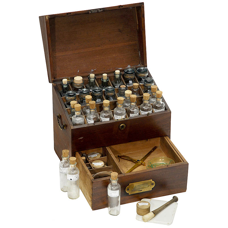 Solid oak case with brass fittings, hinged lid, base with drawer, with 28 glass bottles, mortar with pestle, scale with weights and further accessories (partly added c. 1920), size 12 ¼ x 7 4/5 x 11 in.