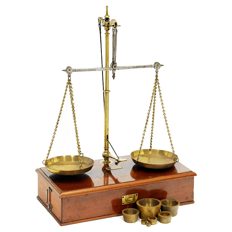 Late 19th Century. Signed: "C. Stevens & Son, London", brass and steel, length of the beam 13 in., in mahogany case with drawer, with nesting 20 oz weight set (complete).