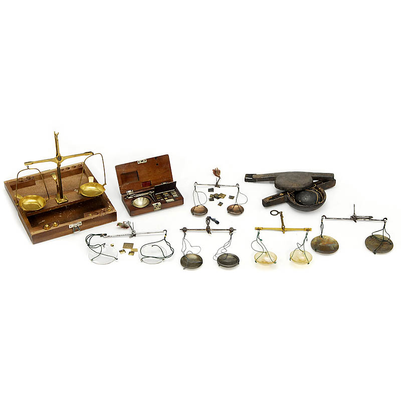 1) English pharmacy scale by "Provost & Crook, Eastborne", 18th century, oak case.