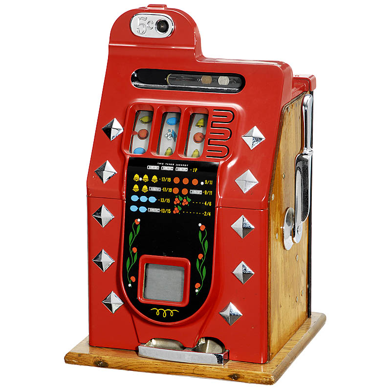 "Mills, Chicago", mechanically operated 3-reel machine with jackpot, 5-cent slot, wooden case with metal front, working, with key.