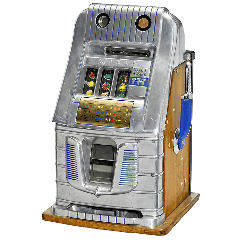 Manufactured by: "Mills, Chicago", mechanically operated 3-reel machine with jackpot, wooden case with metal front (partly broken), working condition but needs some adjustment.