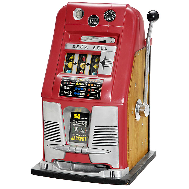 Manufactured by: "Sega, Japan", mechanically operated 3-reel machine with jackpot, wooden case with metal front, working, with key.