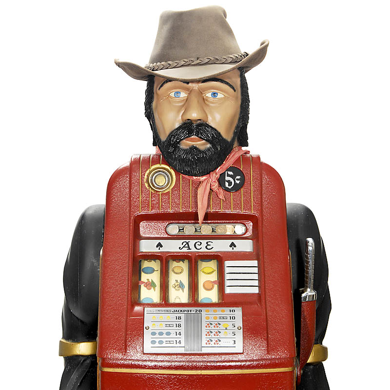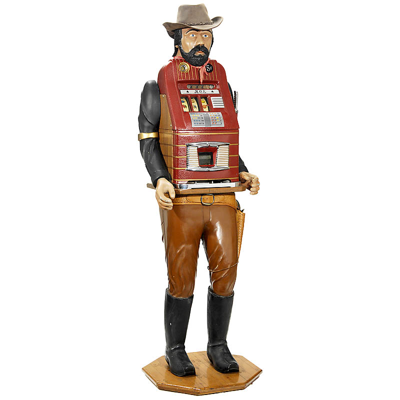 A real life-size American cowboy figure, carved wood on heavy iron base, with High-Top slot machine by "Mills, Chicago", with jackpot, working. Overall height: 73 in.